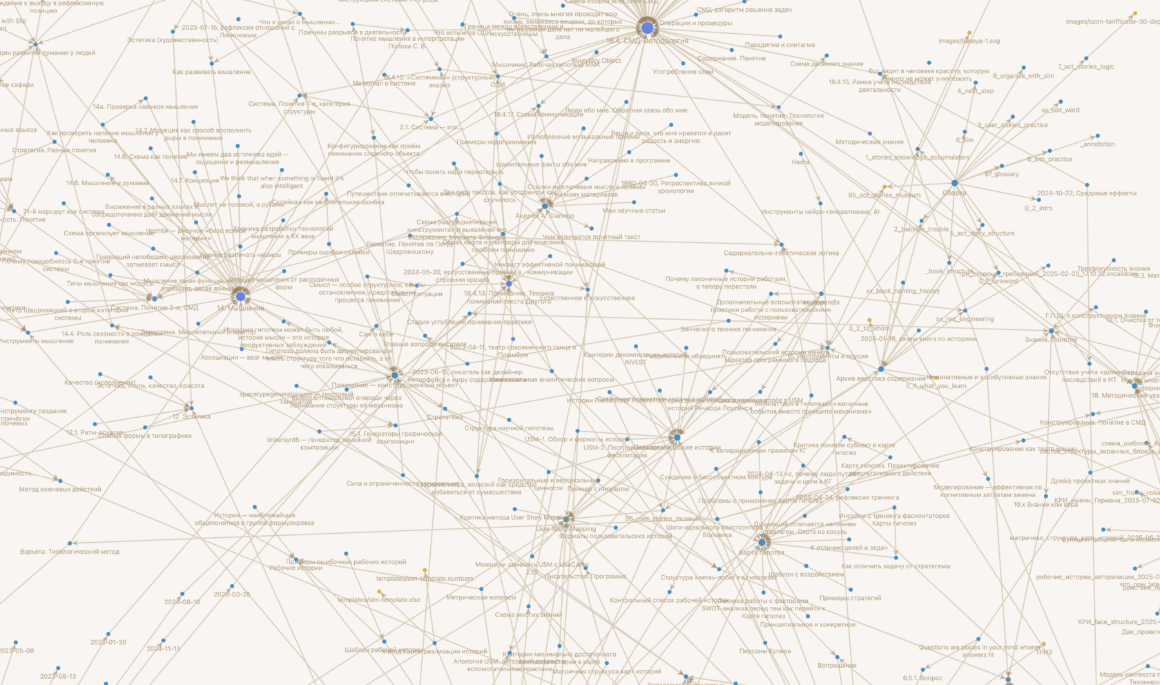 Время от времени ведётся пересборка связей и поиск нового содержания. Нужно отсмотреть материал, проверить адекватность связей, внести изменения. В один из проходов с осмотром материала может прийти озарение, потому что «система помнит» больше, чем способен удерживать в живых нейронных связях человек. Человек в «сейчас» со своим новым знанием встречается с собой в прошлом, и вдруг видит совершенно новый ракурс. Этот режим работы с материалом можно было бы назвать контекстом нового предмета.
