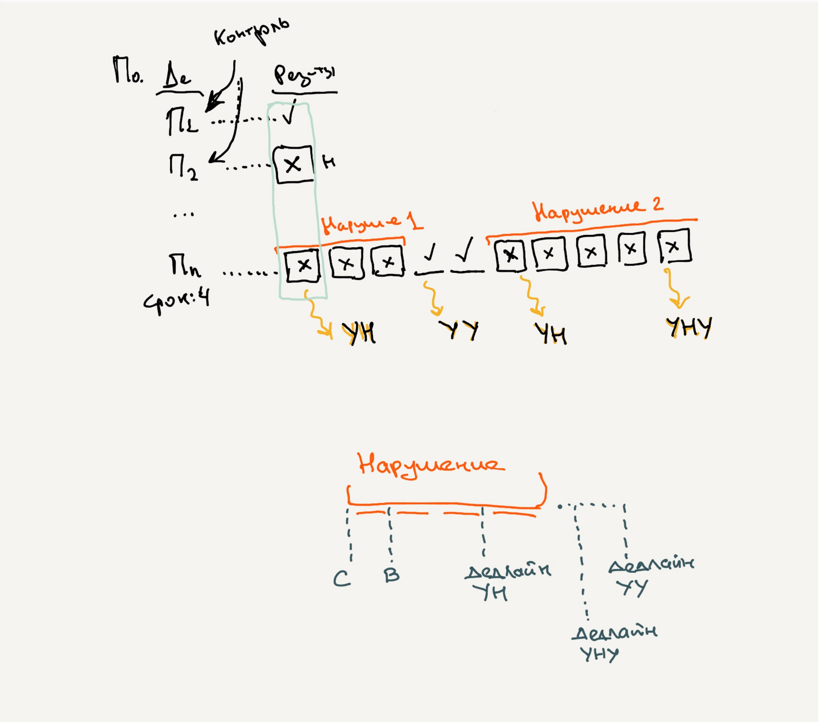 Рассмотрим последовательность фиксаций для показателя n. В первый день нарушения выпускается уведомление о нарушении (УН). Тип этого показателя даёт норму в 4 дня на исправление. Мы видим, что три дня нарушение не устранялось (крестики). На четвертый день нарушение устранено — выпускается уведомление об устранении. Цикл завершился.